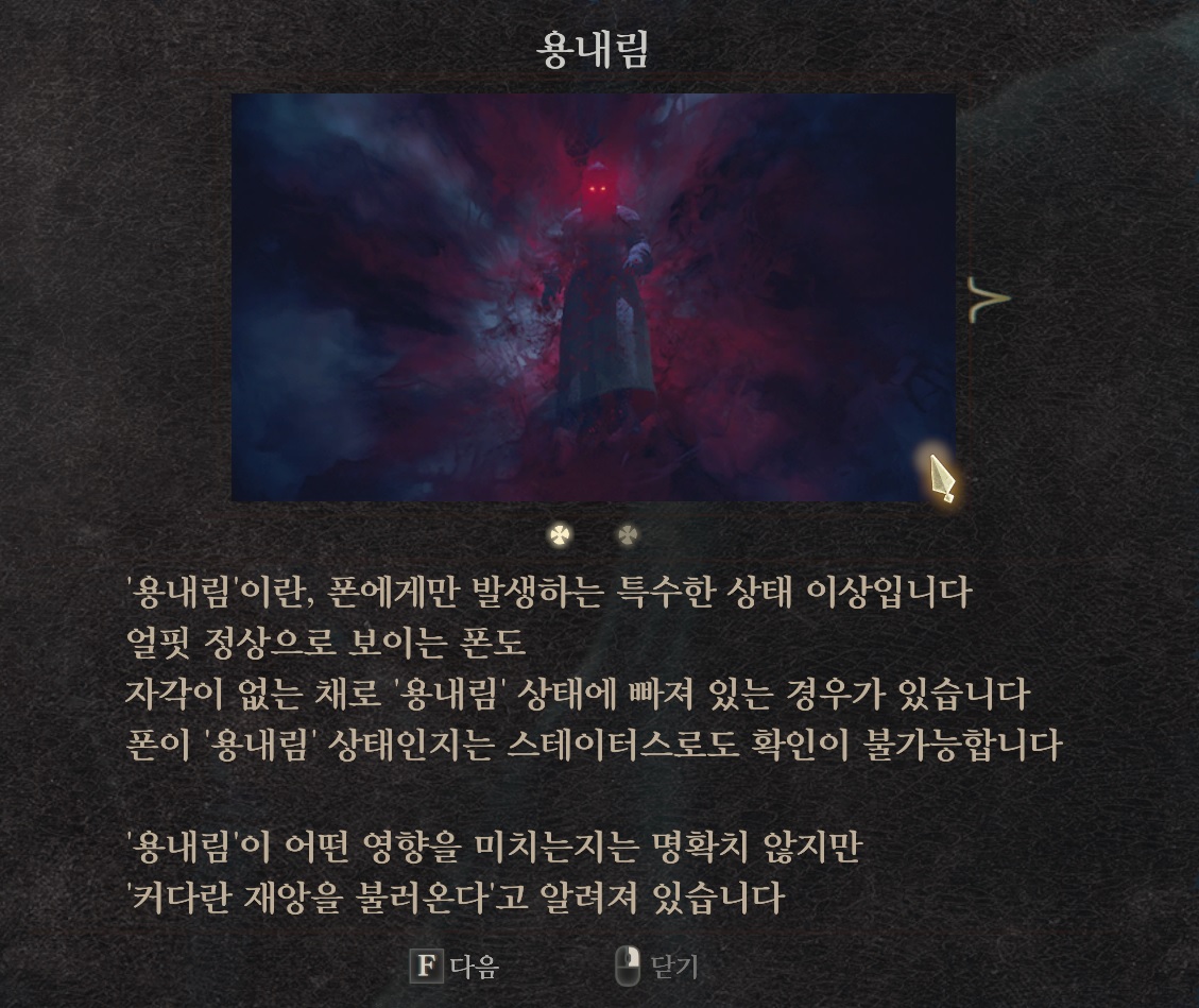 용내림 증상은 눈 빨개지고 폰 대사 변한다 온라인으로 용내림 걸린 유저가 폰 빌려가면 그폰은 용내림 당해서 온다 방지 방법은 오프라인 모드로 변경 혹은 폰 해고나 물에 담구기, 폰 들어서 절벽에 던지기 등등 죽이고 다시 소환해야함 용내림 방치하거나 여관에서 자고 일어나면 컷신 뜨면서 NPC들 역병걸려서 죽음, 가끔식 세이브 파일 백업해서 NPC 몰살 방지해야한다