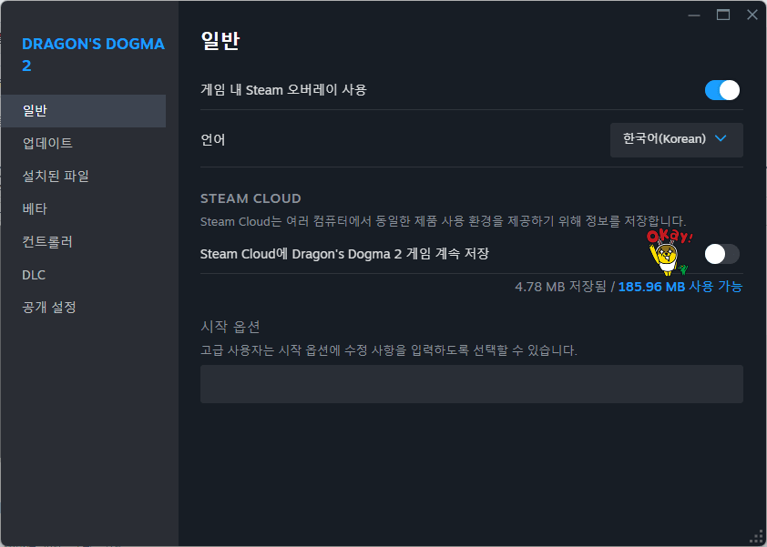 세이브파일 백업 / 삭제 방법 게임종료후 스팀 드래곤즈 도그마2 우클릭 - 스팀 클라우드 게임 저장 끄기