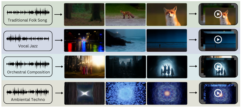 음악을 ‘듣고’ 그것의 감정·리듬을 텍스트(장면 대본)로 옮긴 뒤, 그 텍스트로 비디오를 만들어 음악과 감정적으로 연동되는 뮤직비디오를 자동 생성하는 시도입니다.